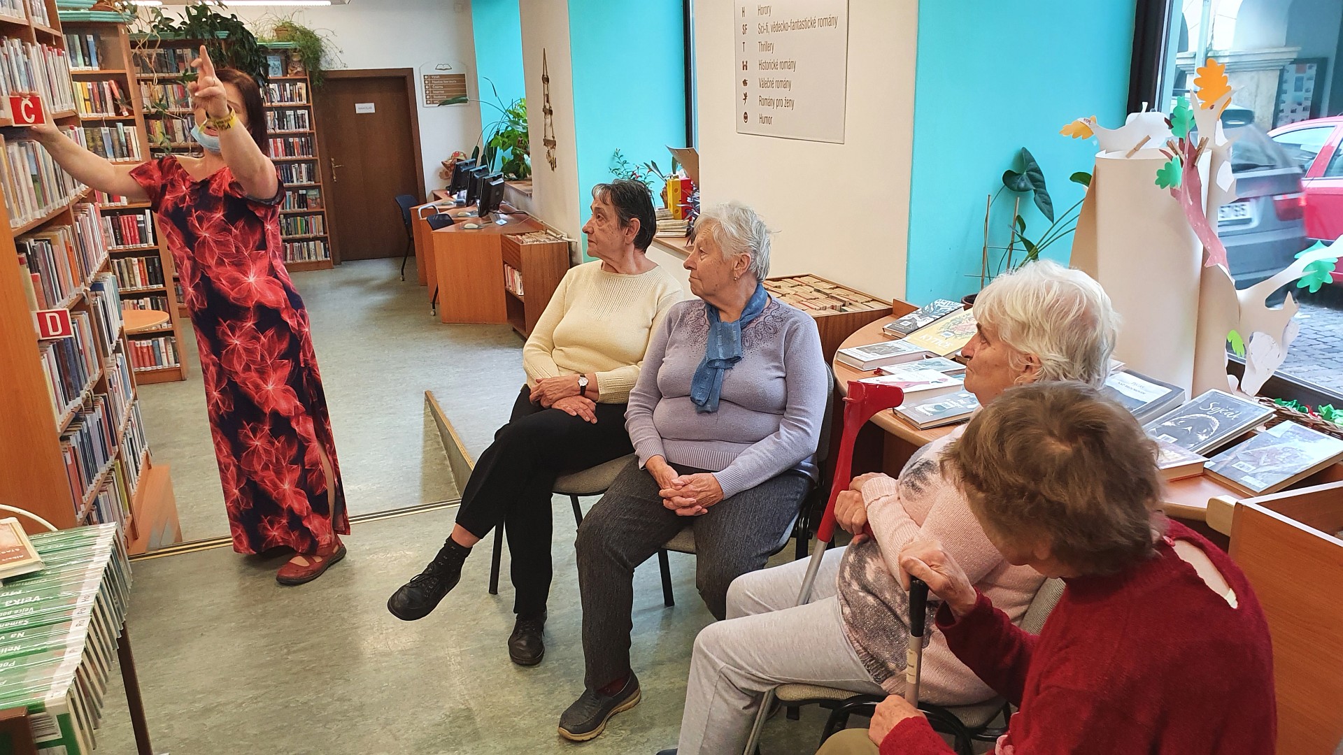 Ve středu 20. října prožily seniorky z oddělení C velice zajímavé dopoledne. Byly se totiž podívat v Městské knihovně. Pracovnice knihovny pro ně připravily prohlídku všech oddělení, povídání o historii knihovny, zajímavosti o knížkách. Klientkám stacionáře se povídání tak moc líbilo, že si domluvily další návštěvu a už teď se na ni moc těší.