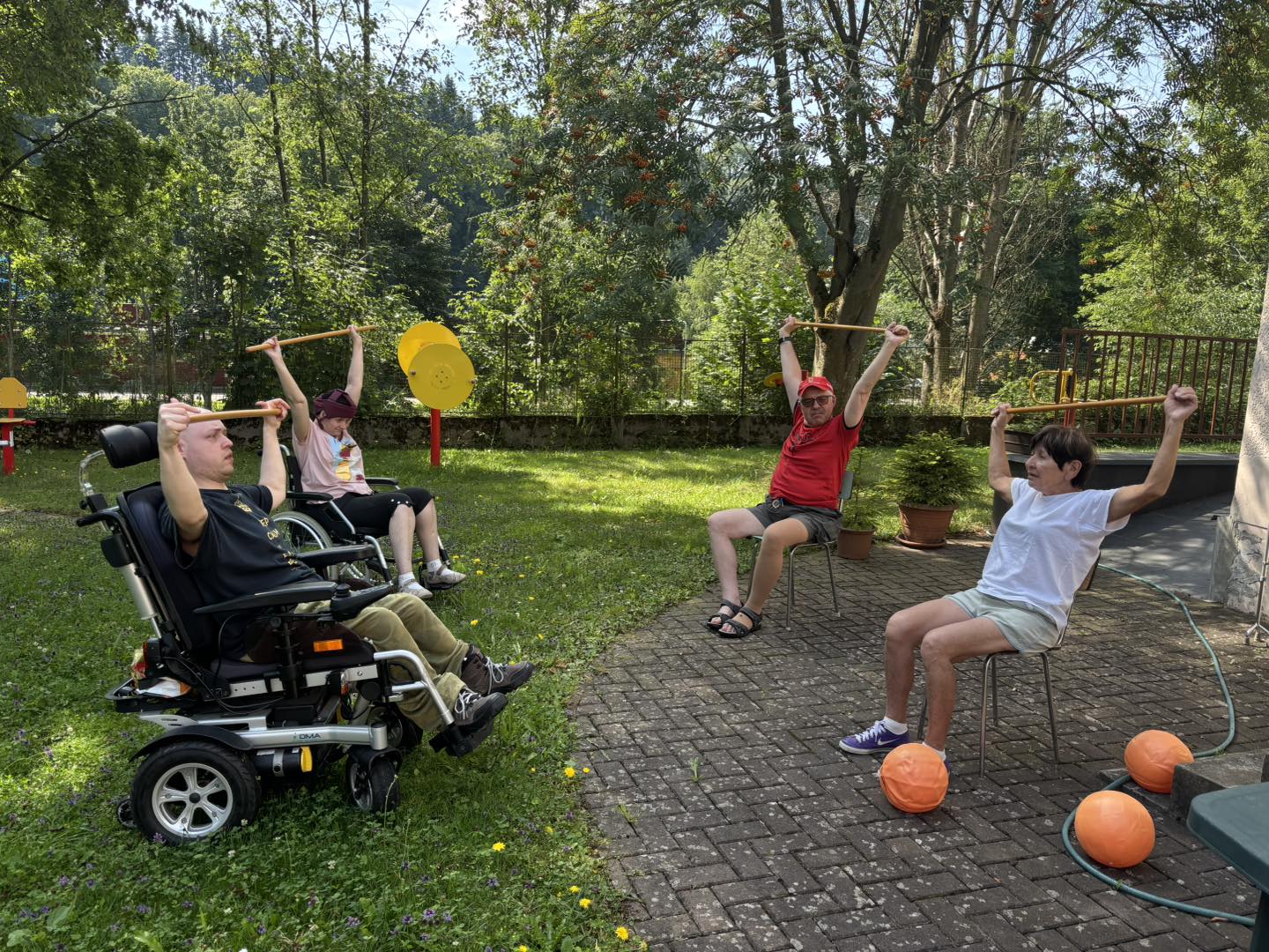 Letní měsíce jsou u nás ve stacionáři vždy obdobím radosti, pohybu a příjemných zážitků. Sluníčko nás lákalo ven a my jsme toho naplno využili. Společně jsme vyráželi na vycházky do okolí – čerstvý vzduch, teplé paprsky a příroda kolem nás dodávaly energii i dobrou náladu. K dyž nás nohy bolely, užívali jsme si sluníčka na zahradě či terase. Nechyběly ani oblíbené zastávky na zmrzlinu, které k létu neodmyslitelně patří. Na naší zahradě jsme se věnovali práci, – zalévání květin, údržba záhonků i pletí. Pohyb na čerstvém vzduchu jsme prokládali i cvičením, abychom si udrželi kondici a dobrou náladu. Důležitým byla setkání s kamarády, povídání, společné zážitky a smích.