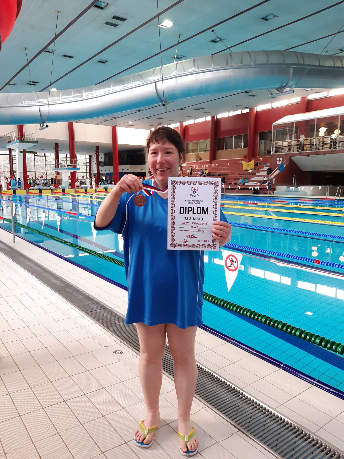 Jako na poli během sklizně zemáků jsme si připadali v krytém bazénu v Liberci. Český svaz mentálně postižených sportovců na severu Čech pořádal mistrovství ČR v plavání. Nikdo z tria našich plavců i přes dobré výkony nedokázal doplavat na medailové pozici. Lovili jsme z liberecké padesátky jednu bramboru za druhou. Když už to vypadalo, že se domů vrátíme s prázdnou, tak předvedla ve svém posledním závodě fantastický finiš Julka Krouzová. Na trati 50m znak se v posledních metrech dostala na medailovou pozici. Vybojovala tak ve svém novém osobním rekordu bronzový kov, který ale má pro nás cenu zlata!