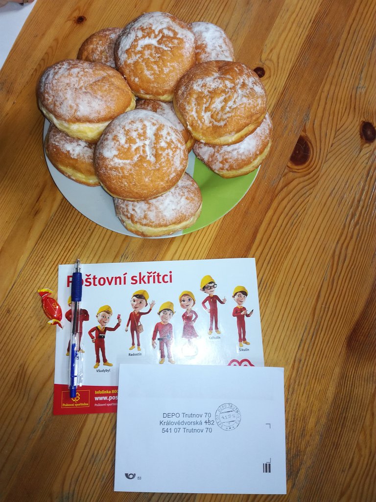 Všechno jsme si mohli prohlédnout, a zkusili jsme si i orazítkovat dopisní obálku podacím razítkem. Dostali jsme výborné koblihy a drobné dárečky.