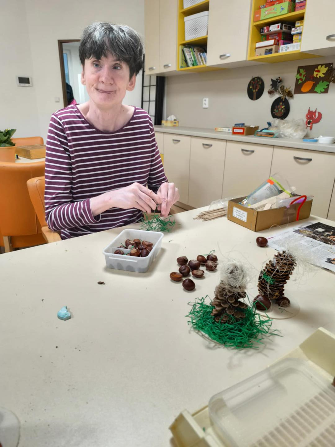 Podzim letošního roku přál jak vycházkám po Trutnově, který se oblékl do krásného barevného kabátku, tak i aktivitám v naší budově. Podzim se svým proměnlivým počasím nám přinesl spoustu inspirace. Byl čas na různorodé aktivity, podzimní tvoření, muzikoterapii a klientům oddělení A také odstartovala kuželkářská liga.