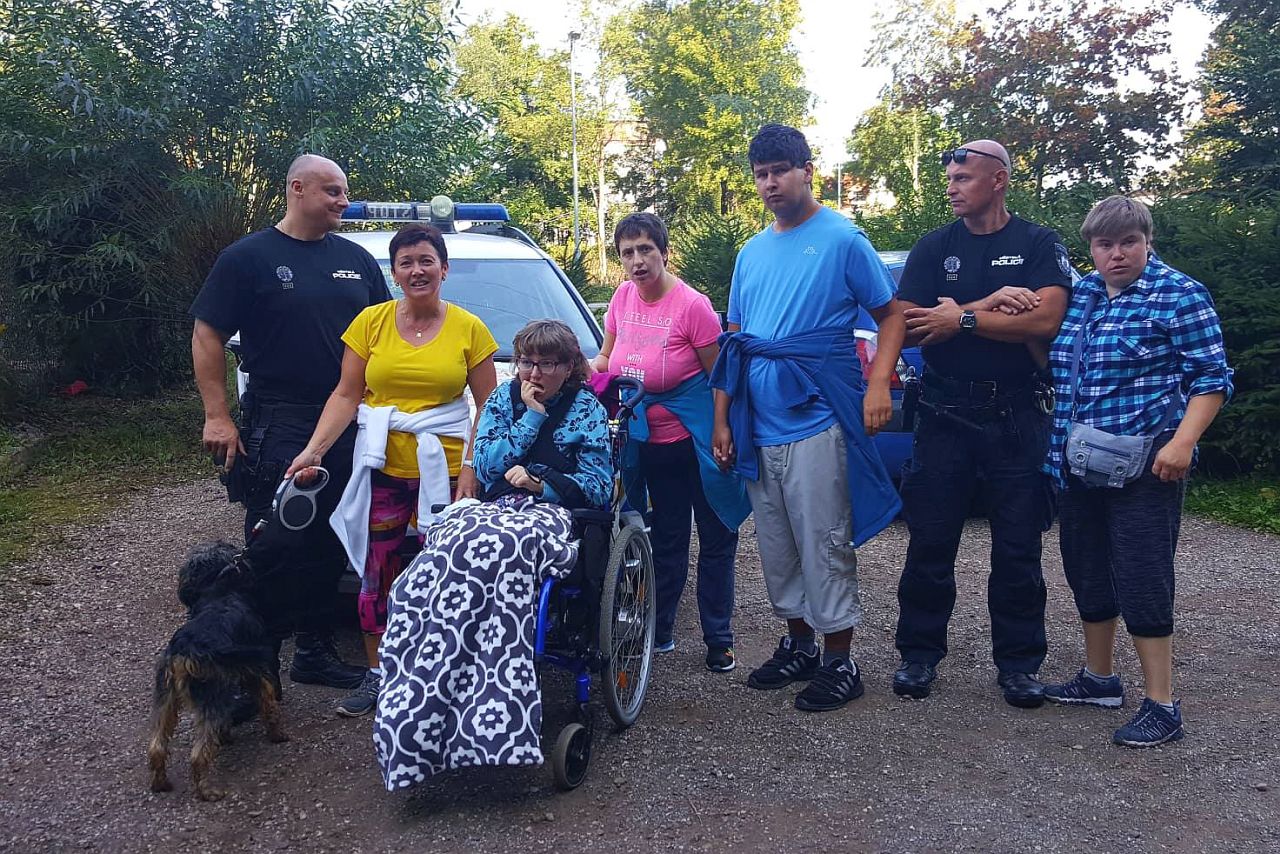 Půlhodinové „venčení“ rychle uběhlo a po návratu k útulku došlo i na setkání se strážníky Městské policie, kteří právě přivezli jednoho chlupáče.